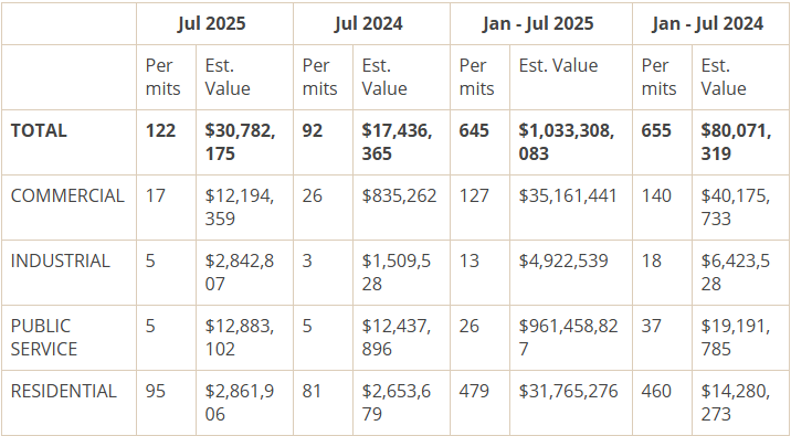 Last month, 122 permits were issued valued at $30.7 million compared to the 92 permits issued in July 2024 worth $17.4 million.