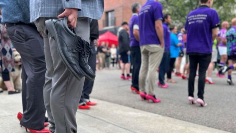 It features a large group of men walking in solidarity and wearing red high heels, what’s become a symbol of the cause.