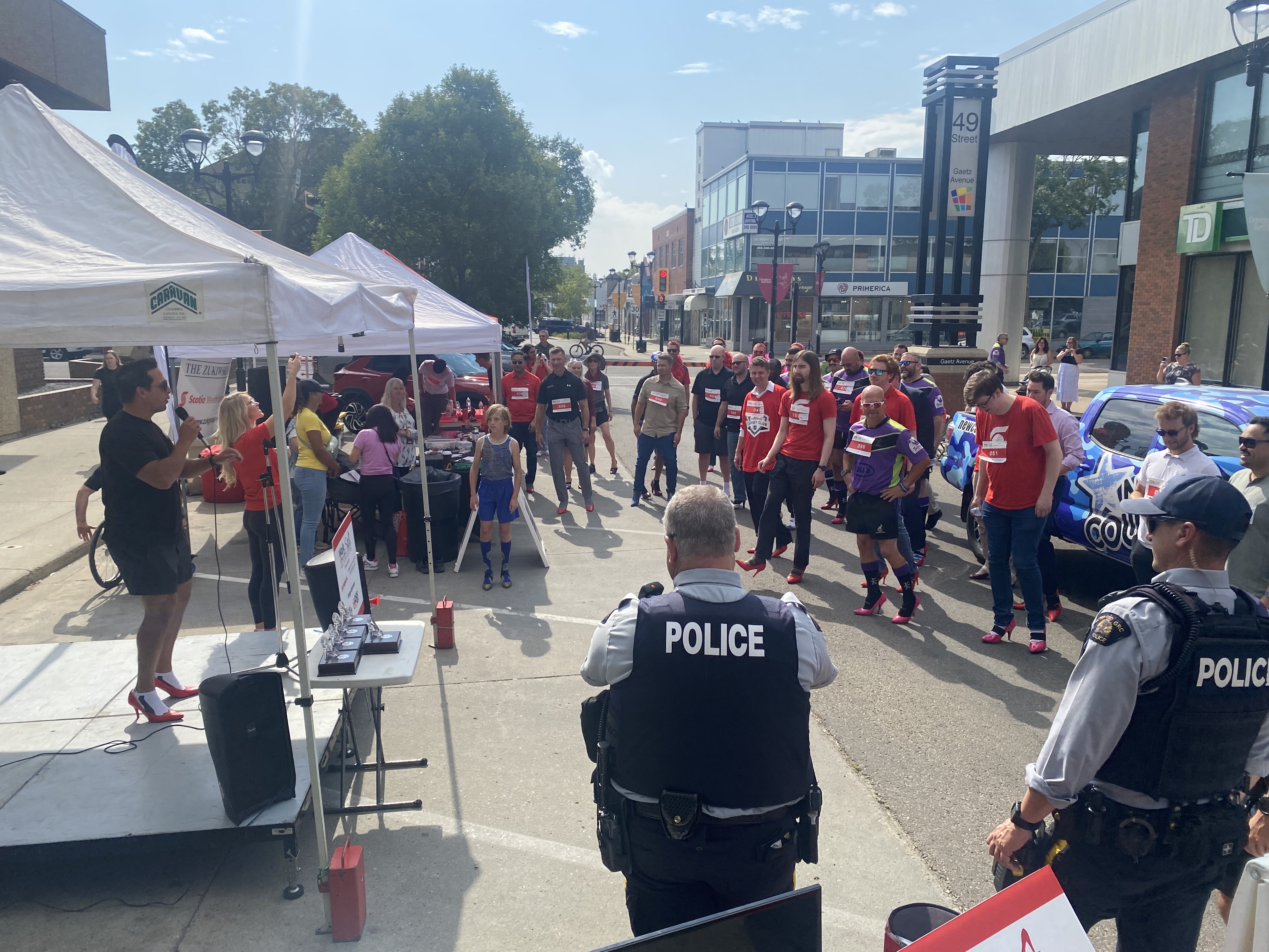 Approximately 60 participants, mostly men and boys walked four laps in high heels in downtown Red Deer to literally walk a mile in her shoes.