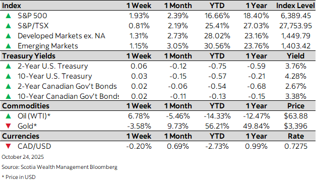 U.S. equities began the week higher on optimism around a U.S.–China trade deal and strong early earnings, but momentum faded after the Federal Reserve (Fed) cut rates by 25 basis points (bps) and ended quantitative tightening while signaling caution on further easing, which pressured markets alongside mixed tech results. In Canada, stocks were steady early on but softened after the Bank of Canada (BoC) delivered its second consecutive 25 bps cut and flagged limited scope for additional easing, reinforced by weak GDP data later in the week. European markets were muted as the European Central Bank (ECB) held rates and offered little forward guidance, with softer inflation and mixed GDP prints failing to lift sentiment. In Asia, Chinese equities lagged despite pledges to boost domestic consumption, while Japanese stocks gained after the Bank of Japan (BoJ) left policy unchanged but hinted at future tightening.