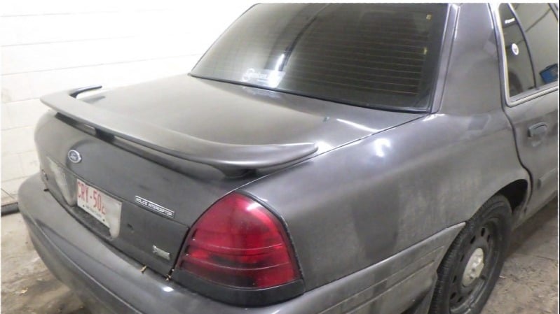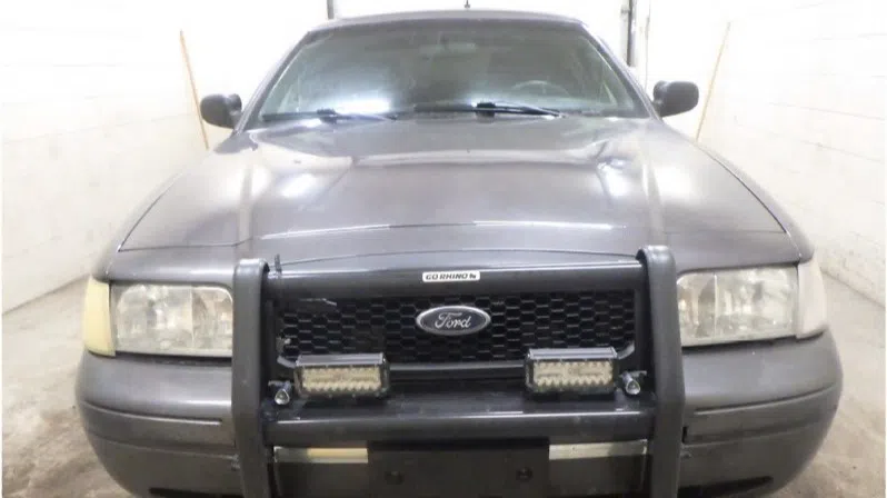 Police say they located an older model Ford Crown Victoria parked at a residence, and it appeared to have a badge on the bumper that read, “police interceptor”.