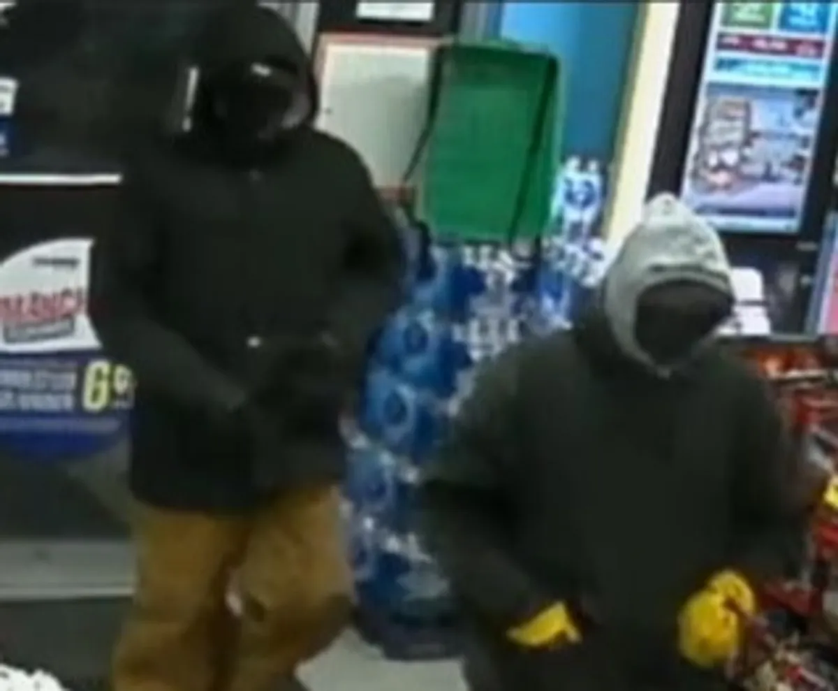 Investigation revealed that two masked men in winter clothing, and one carrying what appeared to be a handgun, entered the store and stole cash and cigarettes.