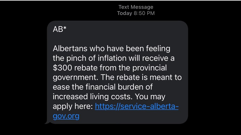 Albertans are being warned of a new scam making the rounds.Consumer Protection Alberta (CPA) says in a social media post that scammers are sending out text messages, informing people of $300 rebates f...
