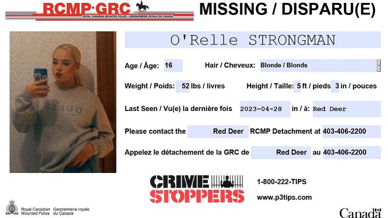 Red Deer RCMP are seeking public assistance in locating missing 16-year-old O'Relle Strongman. Mounties say Strongman was last seen in Red Deer on the morning of Apr. 28, 2023. Police believe Strongma...