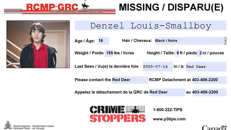 Red Deer RCMP are asking for the public's help in finding a missing 16-year-old boy.Denzel Louis-Smallboy was last seen on July 14 wearing a black hoodie, black skinny jeans, black shoes, and a black ...