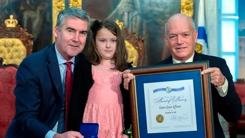 HALIFAX - An eight-year-old Nova Scotia girl who helped rescue her family from a van that plunged into a river has received a bravery award from the premier. Sophia Grace LeBlanc of Amh...