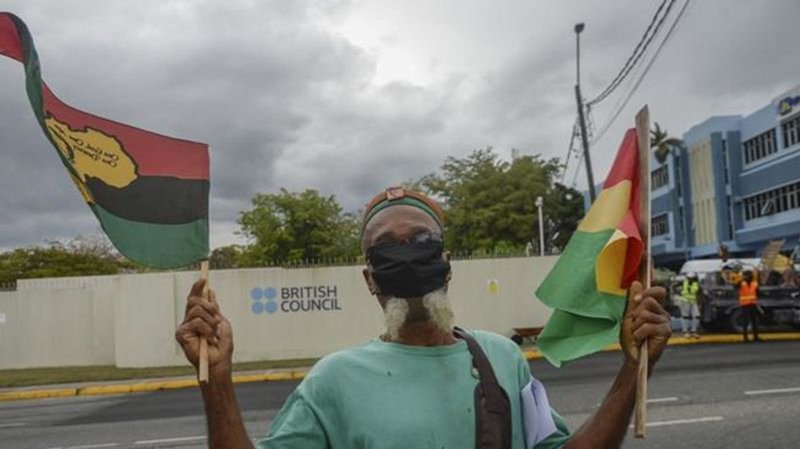 SAN JUAN, Puerto Rico (AP) - Protesters in Jamaica raised their fists Tuesday as they donned T-shirts emblazoned with a pair of shackled Black wrists surrounded by the phrases "Seh Yuh Sorry!" and "Ap...