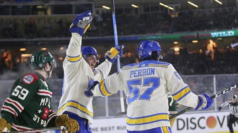 MINNEAPOLIS (AP) - Jordan Kyrou had two goals and two assists in a five-goal second period for St. Louis, and the Blues cruised through the coldest outdoor game in NHL history to beat the host Minneso...