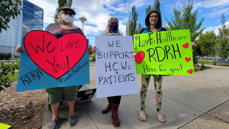 As protests took place outside hospitals in Calgary and Edmonton on Monday, a small group popped up at Red Deer Regional to show some love for health care workers.Dr. Anne Irwin, a retired anthropolog...